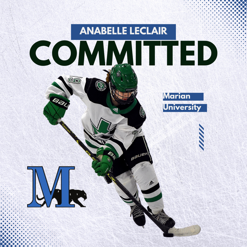 We are excited to share that Anabelle Leclair, daughter of Tina and Robert Leclair, has committed to Marian University to continue her hockey career and pursue a degree in Business Marketing starting in Fall 2025!